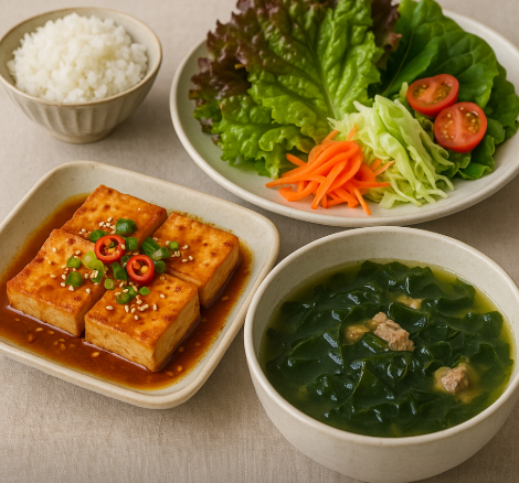 두부조림, 미역국, 샐러드쌈은 저칼로리, 고영양 식단을 찾는 다이어터에게 완벽한 한식 메뉴입니다.